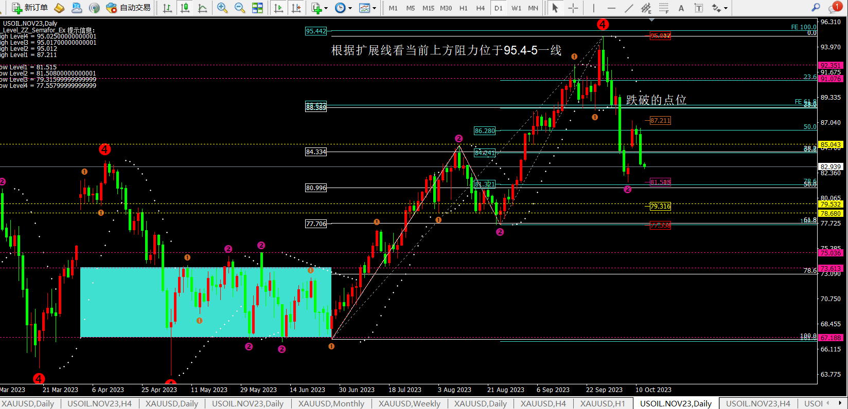 小时线指标目前同样属于震荡回落走势,短期想反弹到84.3的机会也比较小,所以只能等待低位进行多单。