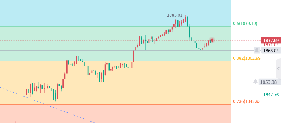周四金价冲高回落,亚欧盘上行,美盘在创下高点1885后回落,主要还是cpi数据的影响。从盘面上来看,本周高开后一路上行,今日主思路还是一个看多,重点关注美盘前金价能否再次冲击1885的高点。具体思路:1870附近做多,止损1865,目标看1885附近。