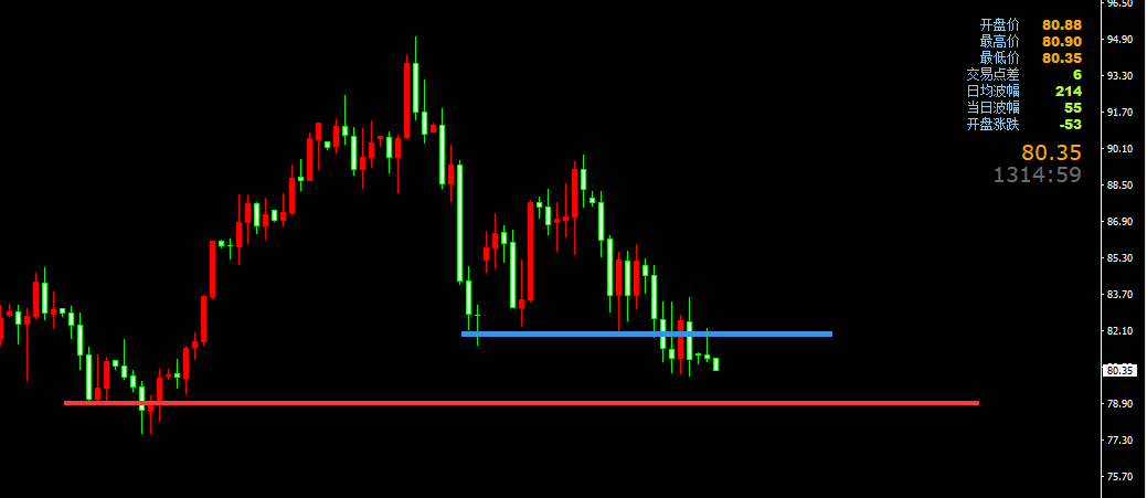 原油初见79.3/4附近多,防守78.6,目标81,反弹81.8附近空,防守82.4,目标80附近