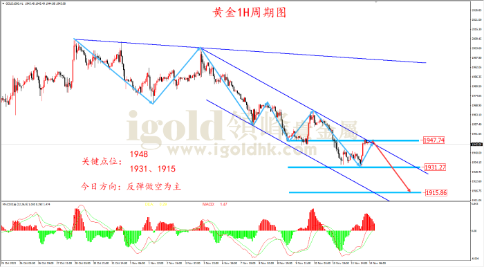 从1H周期走势看,黄金自2009.0附近下跌,高点在逐渐降低,低点也在逐渐降低,空头走势明显。黄金昨日虽然走出上涨行情,但并未改变前期下跌走势,操作上可留意空单机会。结合指标来看, MACD指标DIFF线与DEA线处于零轴附近,红色能量柱逐渐缩短,表明多头力量有所不足,日内可在压力位1948.0附近尝试空单。