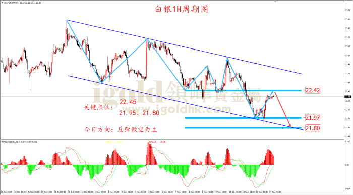 从1H周期走势看,白银自23.59附近下跌,高点在逐渐降低,低点也在逐渐降低,空头走势明显。白银昨日虽然走出上涨行情,但并未改变前期下跌走势,操作上可留意空单机会。结合指标来看, MACD指标DIFF线与DEA线处于零轴附近,红色能量柱逐渐缩短,表明多头力量有所不足,日内可在压力位22.40附近尝试空单。