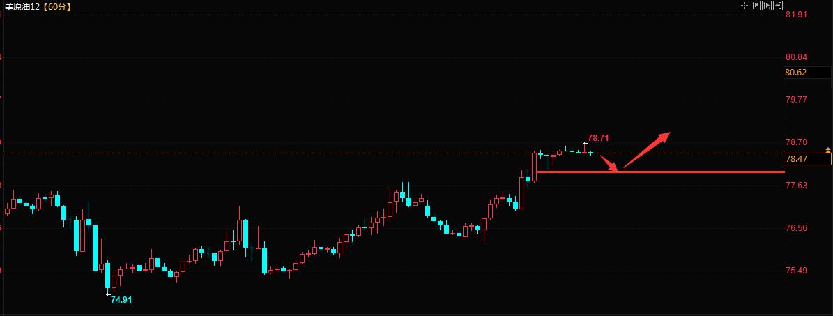 原油今天思路看多,下方关注78.00附近,78.00是昨天凌晨的低点,目标看79.00