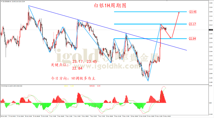 从1H周期走势看,白银自23.59附近下跌,在跌至21.87附近受到支撑,随后走出V形反转,一举突破上方压力线,表明前期下行趋势已结束,后市较大概率开启多头走势。白银昨日虽然走出上涨行情,但并未改变前期下跌走势,操作上可留意空单机会。结合指标来看, MACD指标DIFF线与DEA线高位粘合,红色能量柱逐渐缩短,表明短线多头力量有所不足,或有回调走势,日内如回调至下方22.84附近可尝试多单。