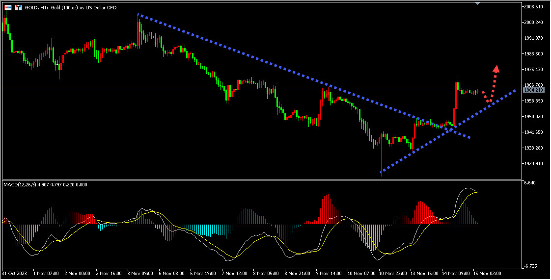 周二美国消费者物价指数显示年通胀率从9月份的3.7%下降至10月份的3.2%,低于市场预期的3.3%。核心通胀率也从4.1%放缓至4%。这表明美国通胀压力有所减弱,削弱了市场对美联储年底前加息的预期。通常情况下,通胀率下降意味着货币贬值,进而对黄金价格产生利好。其次,美国国债收益率暴跌。由于通胀预期下降,市场推测美联储可能会维持当前的货币政策,不会加息。这导致美国国债收益率下降,从而减少了持有美元资产的吸引力。黄金作为一种没有利息的资产,当利率下降时,对黄金的需求通常会增加。然后,美元指数下跌。美元指数是衡量美元相对于一篮子其他主要货币的表现的指标。当美元走弱时,黄金通常会受益。根据文章中提到的数据,美元指数触及月度低点。这表明美元走势疲软,给黄金价格带来了一定的支撑。基于美国通胀报告疲软导致美国国债收益率暴跌的情况,黄金价格上涨并创本周新高。通货膨胀放缓和美联储加息预期减弱,加上美国国债收益率下降和美元指数走弱,都对黄金价格产生了积极影响。未来,如果其他美国通胀数据也显示放缓和消费者数据疲软,市场对美联储紧缩周期结束的预期将更加强化,从而可能继续支撑黄金的涨势。