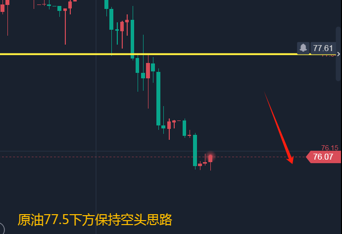 原油昨天整体走势很弱,呈现一个阶梯的慢跌走势,油价在上破均线之后并没有站稳而是再次回落跌破,日线布林中轨的压力还是很强,所以继续保持看空就好,短线上防守就是H4的布林带中轨位置也就是77.5下方继续保持看空就好,所以点位上关注76.6和77.1空,防守77.6,看75.5-74.5!