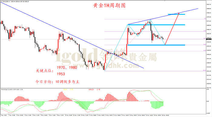 从1H周期走势看,黄金突破趋势线压力,表明前期下行趋势结束,昨日自1975.0附近下跌可看做多头走势中的回调行情,下方支撑留意前期上涨段回撤50%位置,对应点位1953.0附近。结合指标来看, MACD指标DIFF线与DEA线死叉向下,绿色能量柱有再次增强的迹象,黄金短线大概率还有下行,日内如回调至下方1953.0附近可尝试多单。
