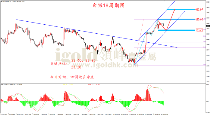从1H周期走势看,白银突破趋势线压力,表明前期下行趋势结束,昨日在23.60附近受阻小幅回落,可看做多头走势中的回调行情,下方支撑留意前期上涨段回撤23.6%位置,对应点位23.20附近。结合指标来看, MACD指标DIFF线与DEA线死叉向下,绿色能量柱增强,白银短线大概率还有下行,日内如回调至下方23.20附近可尝试多单。