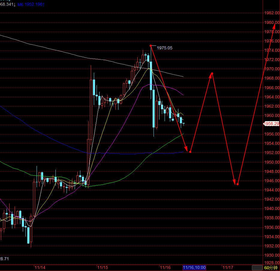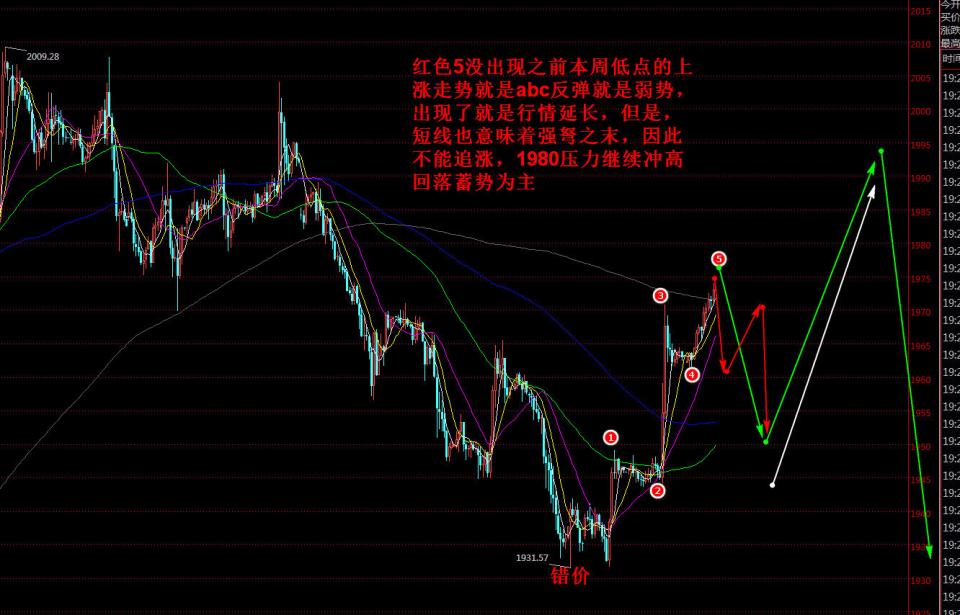 因为盘面上已经出现三山背离特征了,1931.50的上涨昨天刺破1971之后由3浪走势变成5浪,红5出现就是尾巴走势。从实际的走势看,昨晚1975一线闪一下就快速回落,一不注意基本就踏空。昨天下跌相对连续基本上是阴跌到1955.40美元。