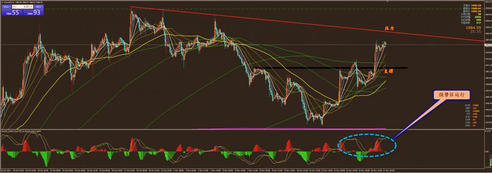 通过对黄金小时图解析得知,黄金从早盘继续维持窄幅震荡调整走势从短期反弹的力度来看相对而言也是比较强劲的目前已经到达前期的底部区域,以及即将要接近上方趋势线的压力位置(1992附近)相对而言有一定的压制的作用,我们从下方的MACD也可以清楚的看到目前已经在强势区运行,说明短期还要向上反弹,下方我们重点关注1969一线的强支撑即可,短期在操作上我们继续高空低多思路,具体建议参考早盘策略