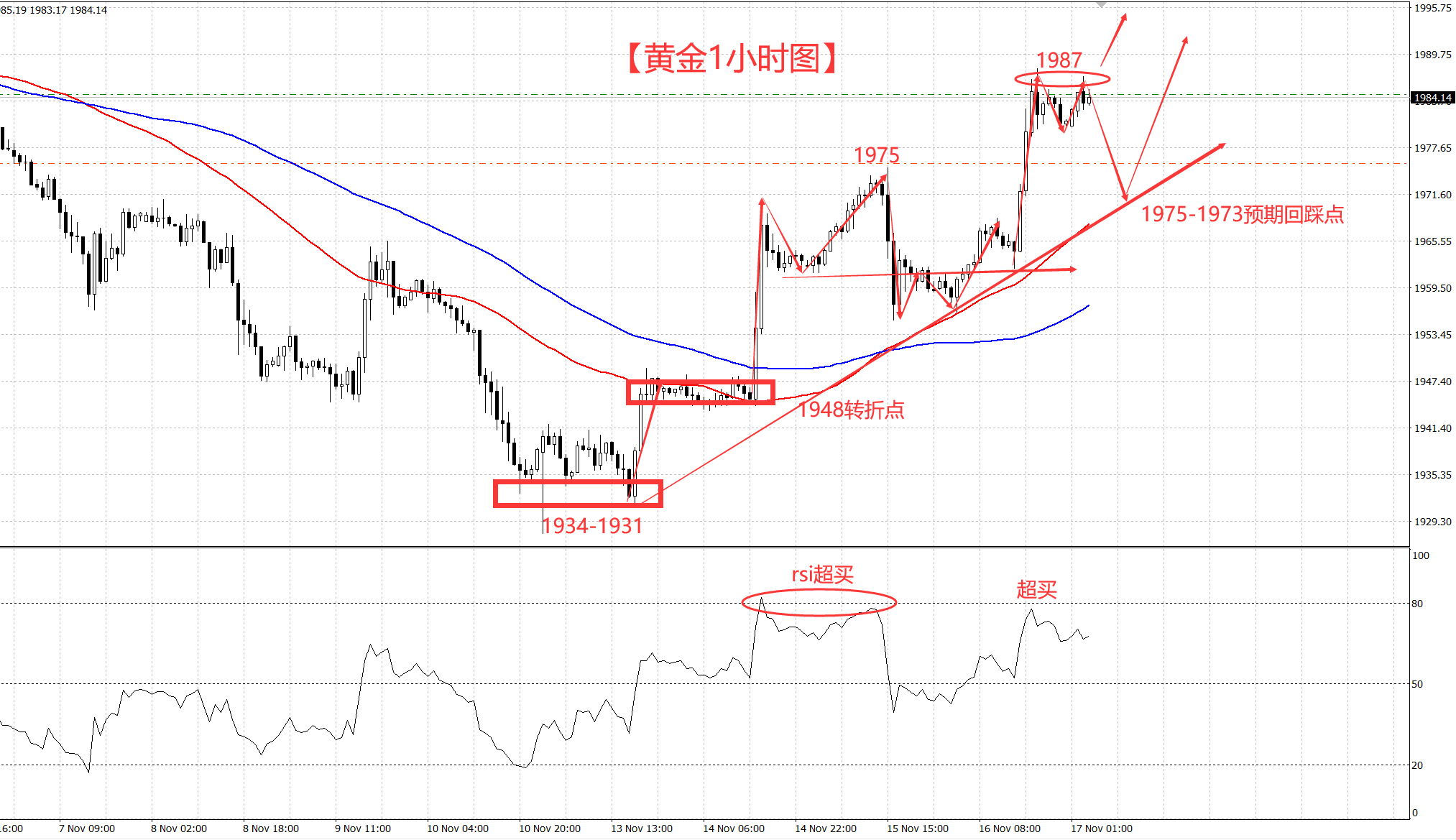 从短周期1小时结构上来看,黄金从1934-1931起涨,一路拉升突破1948之后,冲高1975回踩1956的均线支撑,而且60-100日均线金叉向上,形成新的上行趋势,昨天再次突破1975来到了1987的高点,目前二次测试1987开始承压,而且rsi指标再次触及超买区,这个价格先看一段回踩短期上行趋势和60日均线的支撑,反之,黄金基本今天亚欧盘就是冲新高,美盘回补。