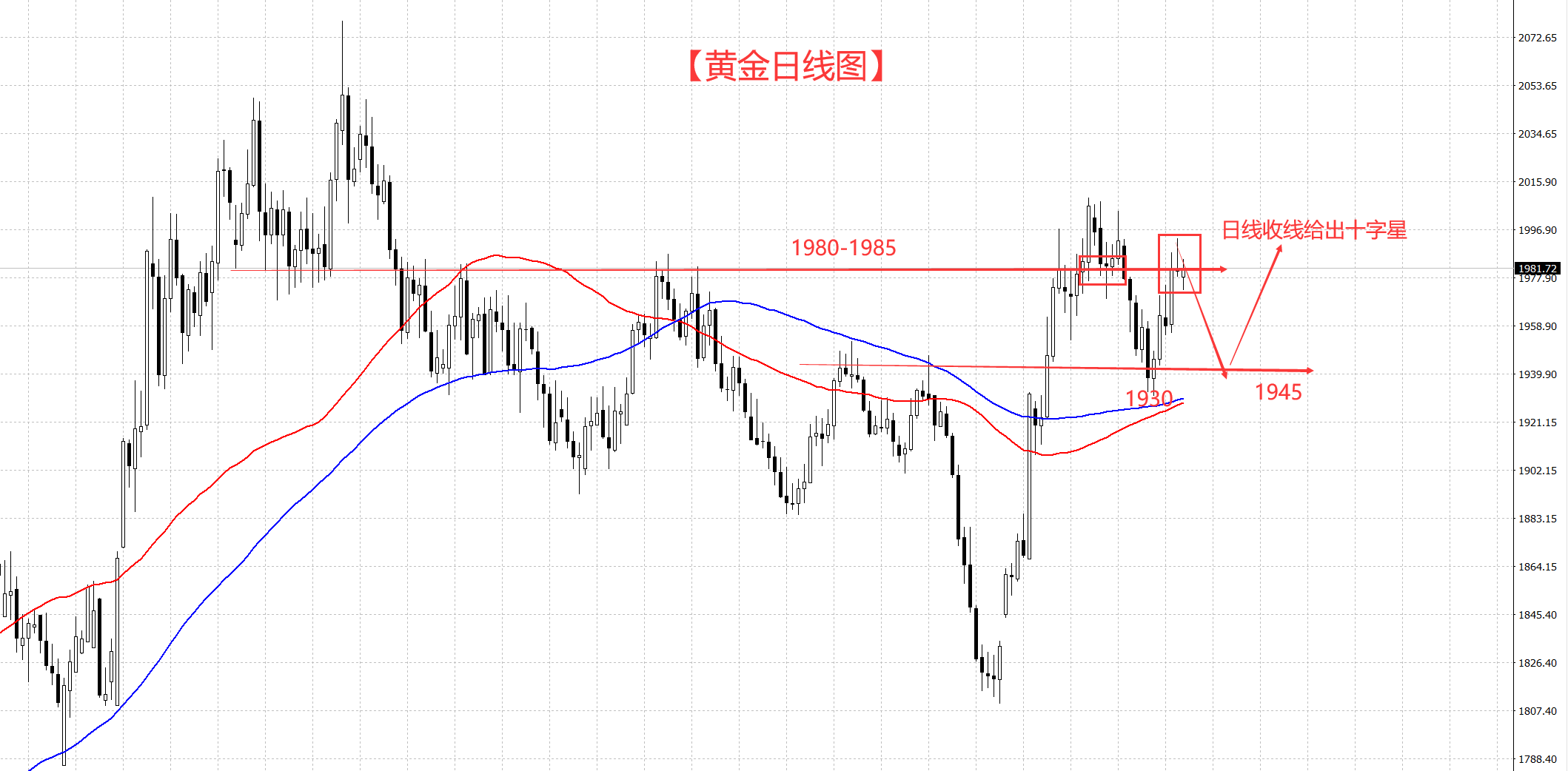 上周五的时候,我就说过,黄金如果日线收线不能顺利的站上1982才是趋势的关键,而且亚欧盘冲高1993,美盘开始回落,最终收线还是收在了1980的下方,说明短期内的趋势还是没得到确认,还是在一段宽幅震荡中。
