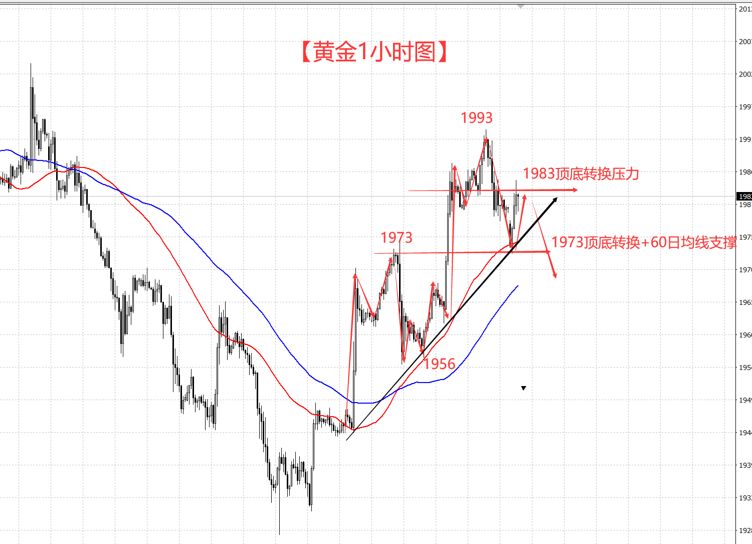 短线1小时结构,今天先回踩1973的顶底转换和60日均线的支撑,目前处于反弹阶段,不过1983再次承压,今天关键压力关注1983一线的顶底转换压力,短期内站不上去,今天整个节奏就很难走出来,将继续维持从早上到现在的十几美金震荡。