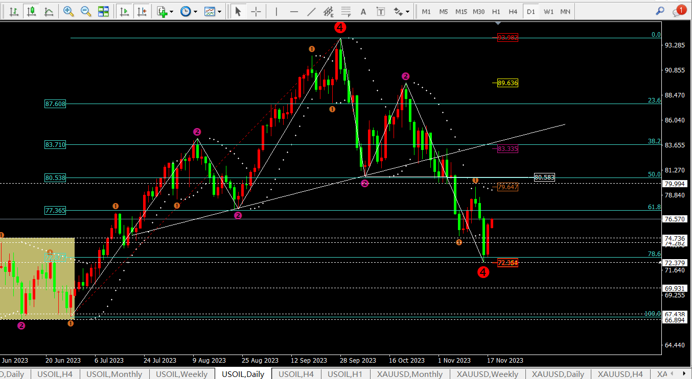 周五价格开盘早间维持在73-73.3震荡,之后价格突破后回撤的低点时73.6一线。之后价格破74后再也没有回落,所以本周低点并没有出现,因此74.1-3本周是有机会的。目前就看价格先上涨反弹还是回落后上涨。