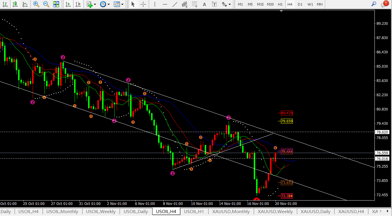 4小时目前macd金叉放量运行,灵动指标sto超买运行,代表4小时震荡偏强。短期关注均线MA60压制77一线。支撑关注75.7-9附近。
