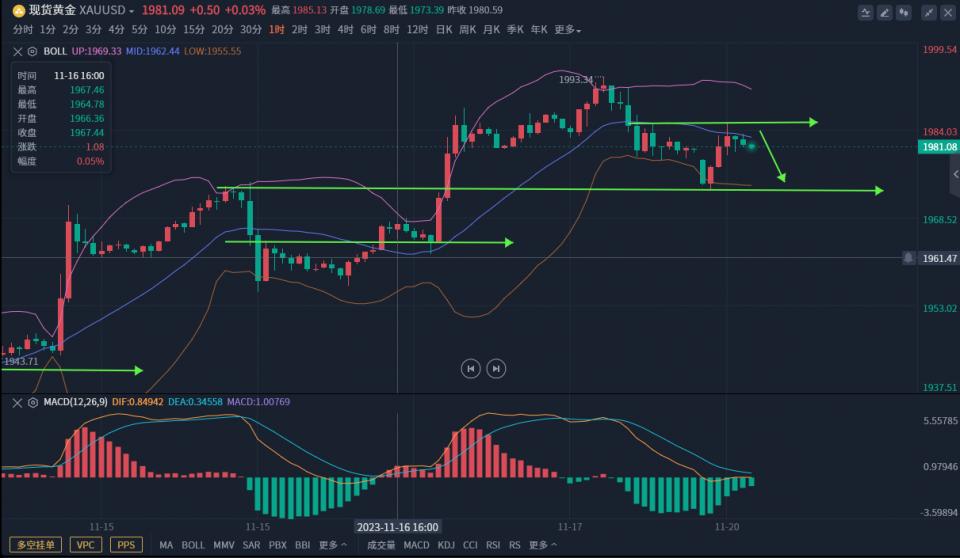黄金方面、上周四晚间黄金大阳上升,直接突破1980,1980是2009下跌至1932反抽0.618位置,直接上升突破凌晨并围绕高位横盘,短线形态表现非常强势,一定不能再空。周五欧盘延续上升走强破高,但是周五晚间上升的延续性比较差,如果晚盘延续走强,回撤的幅度一定不能太大,而周五晚间回撤,吞没了欧盘上升幅度,物极必反 ,所以晚间反抽是可以空一次。关键分水岭1979,虽然说凌晨持续横盘不破,同样上升力度也非常弱,横久必跌,跌破也是大概率时间。