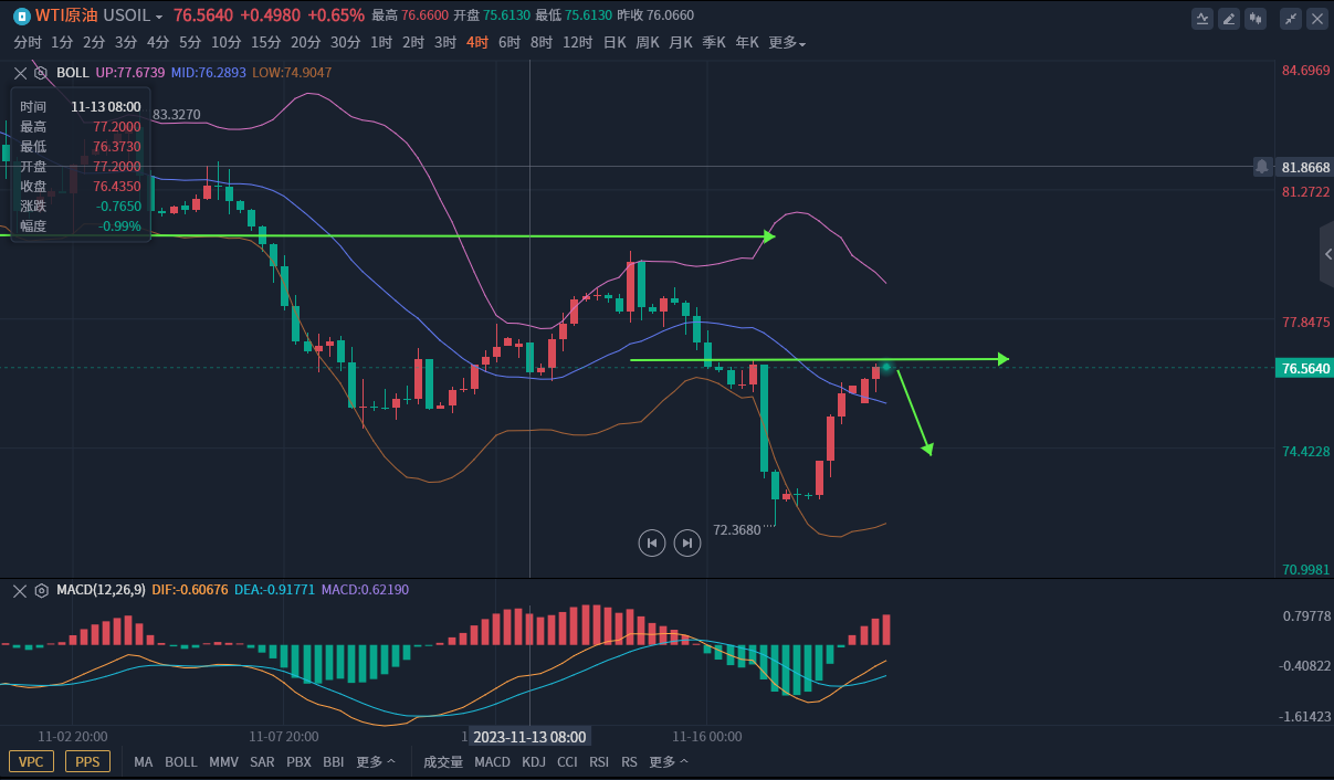 原油:76.6-7空,损77.6,目标75下方