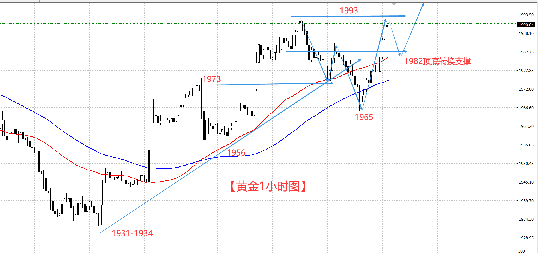 短线1小时来看,黄金自1931-1934反涨以来,一直处于震荡上涨,昨天先是跌破上行趋势给到了1965的支撑水平,反弹以来,目前已经收复了1982的压力,进一步压力将看前高1993的压力,短期在没有突破之前,先看黄金回踩1982一线的顶底转换支撑。当然了,突破也就意味着拉升将延续,下一高点将进一步本想1997-2001的水平价格。