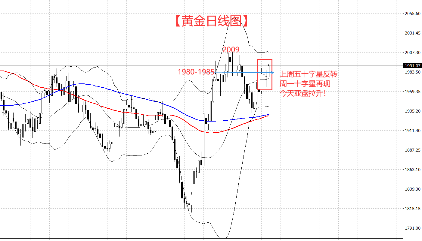 日线结构上,黄金上周五给了个十字星看回调,上一个交易日亚欧盘延续下跌,到了美盘才开始拉升,最终再次以十字星收尾,到了今天更是延续了涨势目前已经来到了1993的前高附近,日线如果今天进一步突破1993的水平压力,那无疑将进一步推动金价延续上涨。