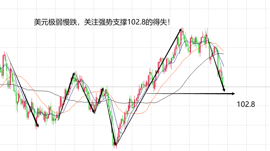 美元在极弱状态下一直连跌,周一也在不断的刷新低点,当前最低在103.2,几乎快要到了这个周期的强势支撑点102.8,所以,目前美元关注的重点得失还是要看102.8低点,如果本周跌破102.8,那么后市会出现大跌空间,如果不破102.8,可以看一波反弹走高空间,这种走势也将会影响黄金未来的发展,是继续走高,还是在高位走震荡回落,暂时还需要延续美元的弱势,看强。