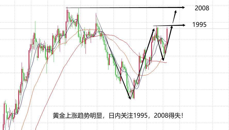 开篇先强调当日行情的核心思路:黄金保持多头趋势,破位1995,出新高,再看2008!周一黄金先涨后涨,走宽幅震荡,虽然下跌空间较大,但并没有改变暂时黄金的多头趋势,经过午夜的收高,黄金暂时收高至1990附近,距离前期高点只差3美金,那么,毫无疑问,这波黄金回落调整走完,短期内还没有见顶,周二延续多头趋势,出新高的可能性非常大,因此,周二还是需要保持做低多看涨。从技术面来看,日线在周一收十字星,跟上周五在1993的顶部十字星相配合,形成多空对垒状态,上方压制很强,下方支撑也不弱,此时是一个多空争夺的状态,但由于前期黄金是从1931开始上涨,整体呈现多头趋势,所以,暂时的多空争夺还是偏向于多头趋势,因此,周二早盘开盘继续上涨是释放周一美盘的多头力度,因此,今天日线可继续收涨,再看上方高点1993,或2008高点。至于是否能走出更大的空间,还需要行情变化再来确定。小周期中可以看到,H4周布林收口,上方压制点也刚好在布林上轨1995附近,因此,日内做多看涨先要关注1995点位得失,如果亚欧盘不破此点位,可以在高位短线做空,看一波回落,而做趋势利润,则要等待回落至单边均线支撑点1985或1980附近多,在看向上看1995,展望2008高点。