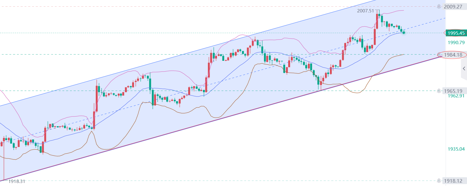 黄金盘面上来看,整体偏上行且上行通道完整,但是周二的拉涨接近通道上轨,在快触及2009的高位后展开回撤。隔夜给大家在2005附近布局的中线空单目前抵达第一目标,今日亚欧盘看能否跌破布林带中轨去往我们的第二目标位,也就是向布林带下轨1985附近运行了。现在黄金一路高涨,在前高2009附近给予了尊重开始回撤,但是回撤下方的支撑也是一阶接一阶,当前的1995支撑明显,现在主要是看欧盘开盘后的走势,如果能够跌破 1995那么1984就不成问题了。日内短线操作方面的:日内若一直在1990上方震荡,无法破位1990,美盘大概率将继续走强,美盘要做多黄金;日内若跌破1990一线,上方反弹1995-1998区域做空;下方首次触及1986-1987一线做多一次