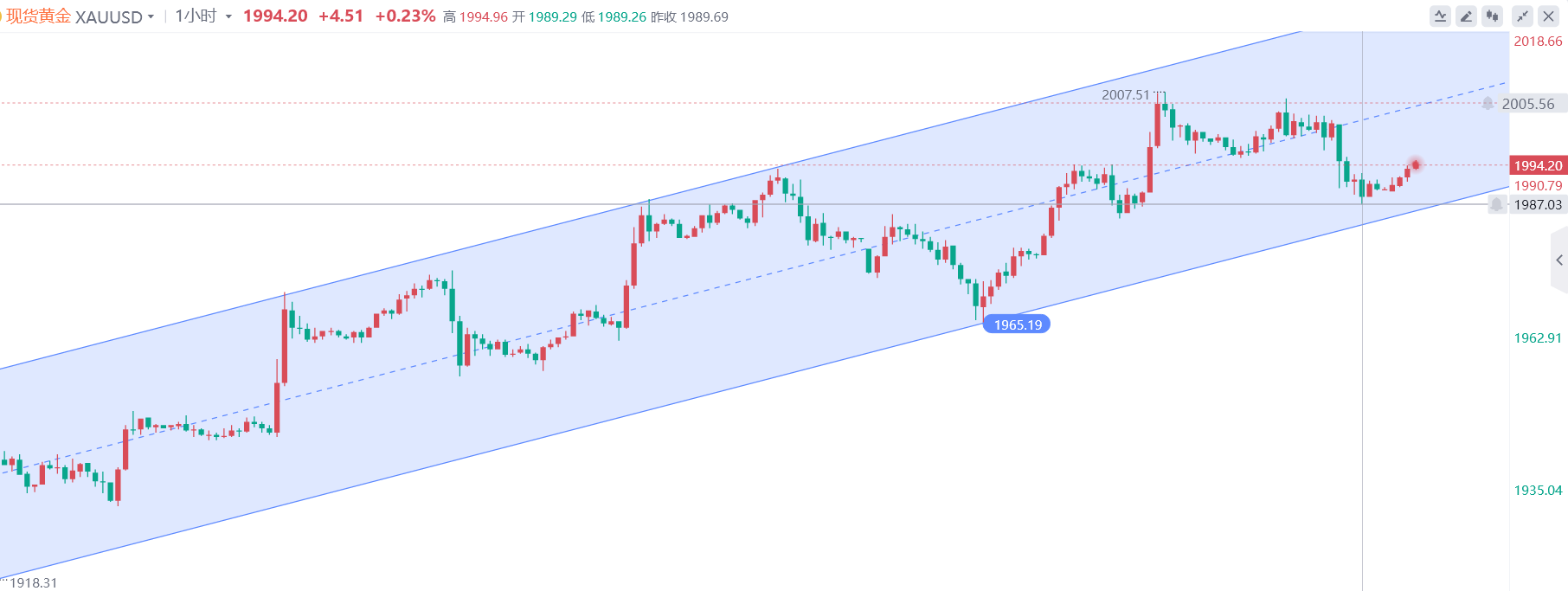 周二2005附近的中线空不负众望到达94,昨天行情最低1986现在主要看黄金能否跌破上升通道去到我们的最终目标1965附近。回顾一下周三的走势,总体一个冲高回撤,上方的2009前高压制住金价,本周在2007附近走出了双顶形态,小时级别直接从布林带上轨跌破下轨,在1986止跌反弹,现在的金价虽然在高位震荡,但是秦氏金升这边还是以高空布局去看金价下行,今日亚盘等待反弹1998附近打算布空,看好金价跌破1986昨天的低点下行。