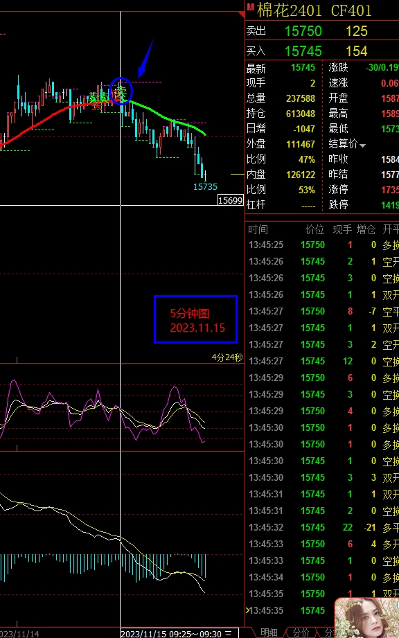棉花2401:基本面来看近日受郑棉持续低位震荡影响,内地部分棉区籽棉收购价有所下跌。部分棉农交售积极性提高,也有棉农看好后市有意在春节前售卖。22日巴基斯坦进口棉需求持续冷清,仅少量纺企采购新棉。近期纽期偏弱震荡之下,贸易商更加关注前期订货履约情况。现货市场报价持稳。巴西主产棉区马托格罗索州种植棉花通常分两轮,第一轮同大豆种植时间接近,第二轮在大豆采摘后进行轮作。目前极端干燥天气迫使部分棉农从大豆转向棉花。技术面上来看大体处于下行通道中,中线维持阶段性下行,前面我们指标给出的超短线是买入信号价格如期反弹,今日继续关注低位震荡下行情况,前面我们的指标显示短线给出的是卖出的信号价格如期下行,根据我们的指标显示目前趋势波段给出的仍是卖出信号,下方关注15000/14755,上方关注15500/15925一线压力情况.