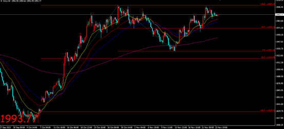 国际黄金周四(11月23日)维持震荡走势,开盘价1994.81美元/盎司,最高价1998.29美元/盎司,最低价1986.71美元/盎司,收盘价1991.95美元/盎司.