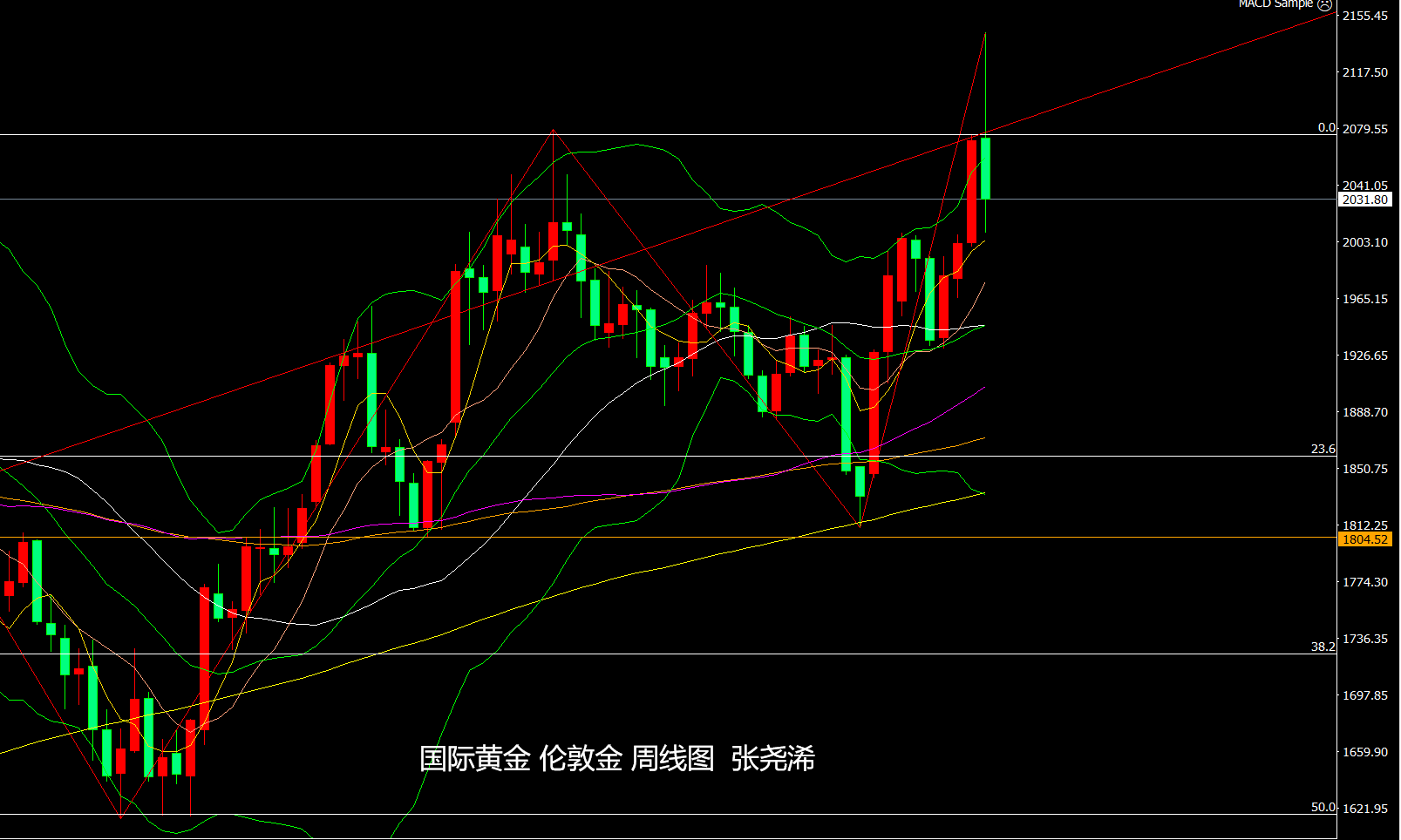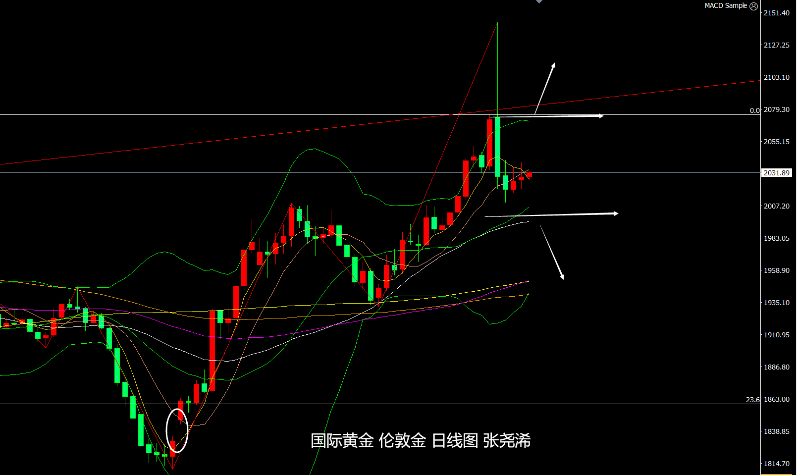 周线级别:金价本周开盘延续上周触及2075美元一线的强劲力度,进一步走强并刷新新的历史高点,但目前走势大幅回落转跌,其走出的长上影线倒垂,也为后市空头增添了看空压力。并使其有望展开连续回落触及中轨线支撑目标或百均线支撑目标。但现在空头力量减缓,如反弹冲高2075美元上方,则有再度攀升的风险,在此下方,则仍可觊觎回落触及中轨及百均线目标。