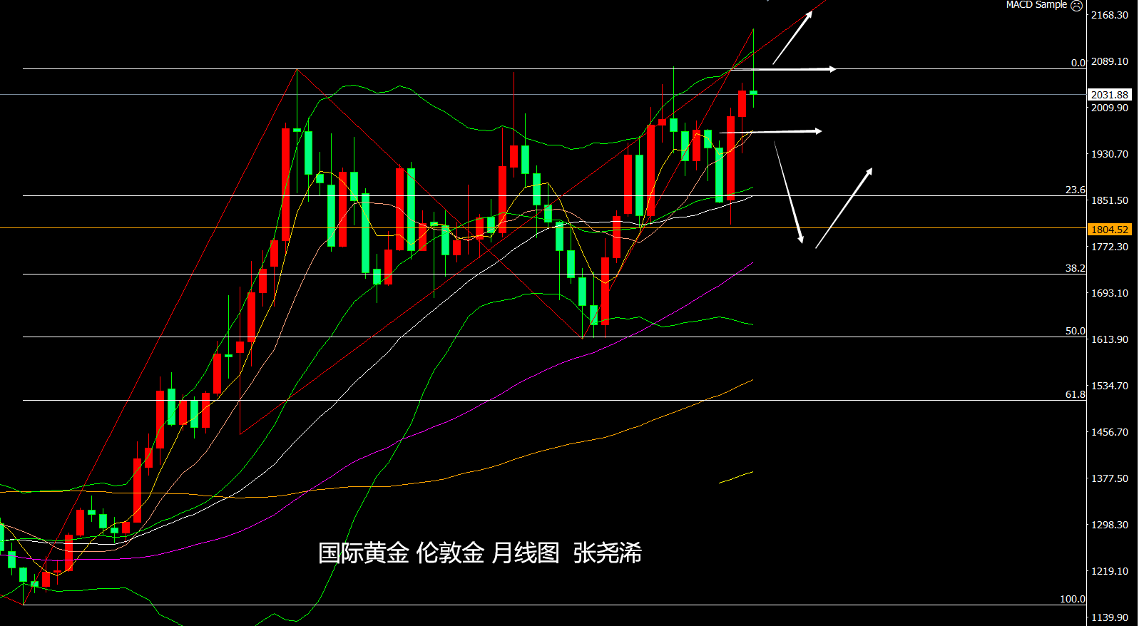 技术上:月图级别,金价11月触底回升收取长脚下影线,12月目前也走出冲高回落的长上影线K线,如维持此形态收线,后市将偏向2000美元关口附近盘整震荡,除非跌破5月均线支撑,将增强见顶回落的看空力度,并将觊觎触及中轨线目标以及60月均线支撑的目标预期。并就此再度进行长期看涨,目标年线级别的5浪幅度2500美元保持不变。