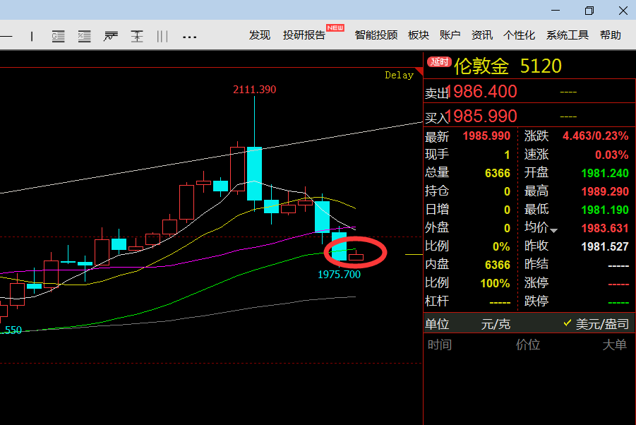 虽然后半夜黄金止跌于1975,但是日线图仍然以大阴线收盘,那也没什么好说的,今天继续看空。早盘黄金反弹于1990下方受阻回落,而这里也是40日均线压力位,也是后半夜跌破口位置。