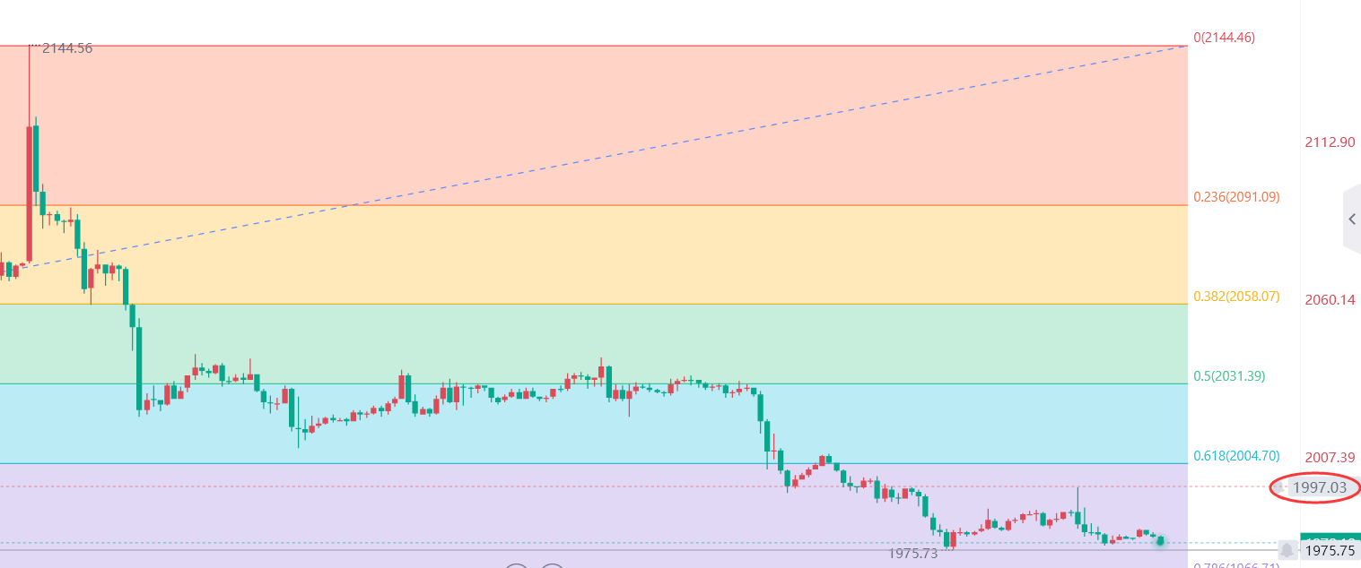 黄金经过2144下跌到1975以来是170个点的回撤,目前还没有一个像样的反弹,昨天的cpi数据,黄金价格仅仅反弹到1996后就没有延续度再次走跌,但是下跌并没有跌破数据前的低点1975且收盘在1979附近,这个信号可以当作下跌乏力,也可以理解为下方的空间有限。那么今日与本周的操作思路就是看超跌反弹了,上方的压制为2000的整数关口,多空分水岭在2007这里,至于下方的支撑,可以参考1966这里。现在的思路是1966-1975区间去分批布局一波中线多单看涨破2000关口。但是短线思路可以在1975上方短多看今日的反弹力度的大小。