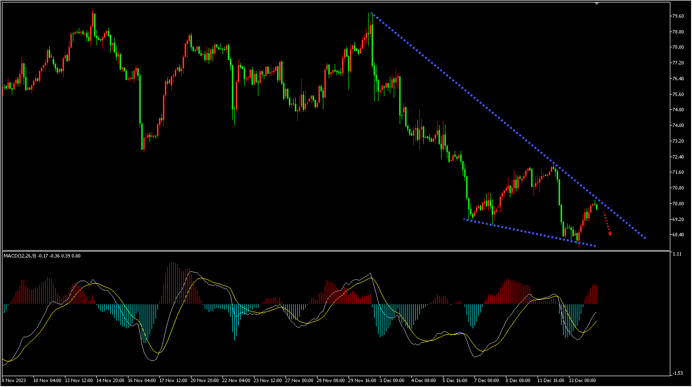 周三(12月13日)COP28达成协议后,2024年及更长期的石油前景更加悲观。投机者在这一趋势中发挥了重要作用,他们大幅削减多头头寸,同时增加空头头寸。对石油需求增长的过度担忧加剧了市场动态,这对市场情绪产生了负面影响。原油昨日按照预期在2小时阻力位开始反弹,反弹至2小时下跌趋势线压力区域,今日重点关注2小时下跌趋势线压力位表现,尝试继续做空原油。