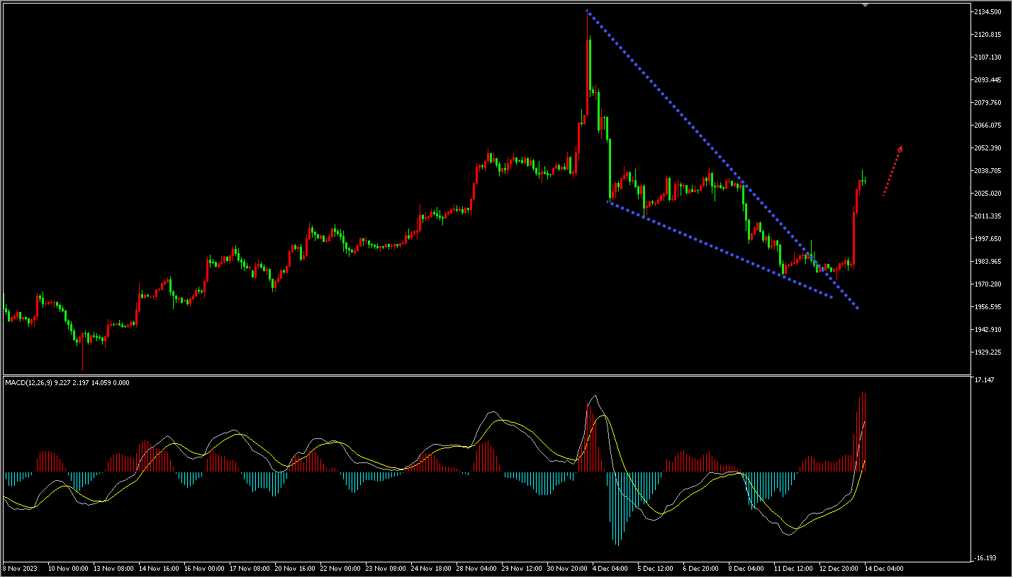 周三(12月13日),黄金先是在2小时支撑位反弹,震荡调整后突破2小时下跌趋势线压力位,随后随着美联储转向“鸽派”,公布利率不变,市场押注2024年降息的呼声扩大,美元指数及美国债券均大幅下滑,黄金避险功能凸显,导致以美元计价的黄金价格录得近两个月来最大涨幅。今日关注黄金调整力度,调整结束后做多黄金。