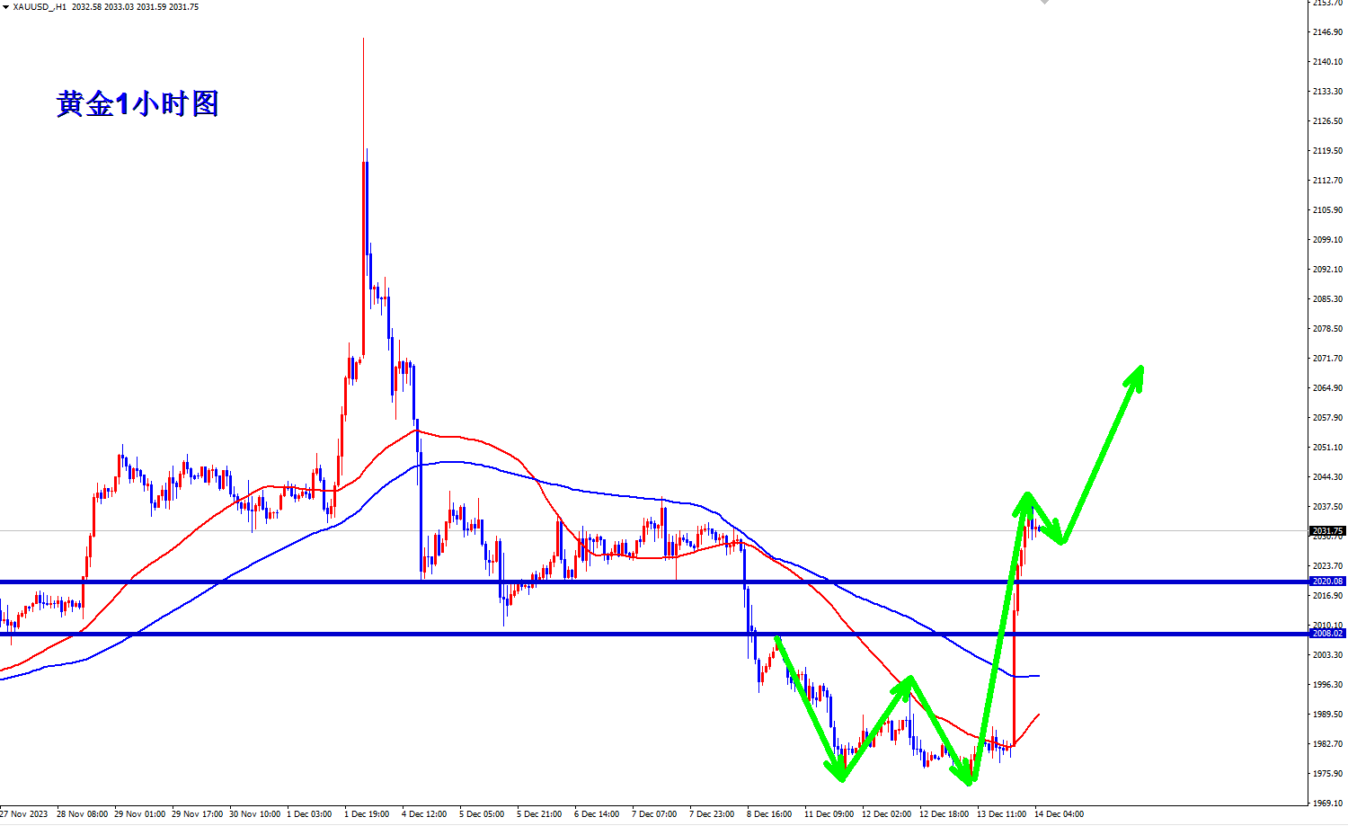 黄金1小时均线已经开始拐头,如果能上穿成金叉,那么黄金多头就还不断会有新高,黄金底部大阳之后,多头动能冲足,早盘窄幅震荡就是为了再次蓄势上涨积蓄量能,黄金1小时双底结构,回落就是给干多的机会。早盘2031附近可以先顺势多起来,黄金将继续蓄势上涨。