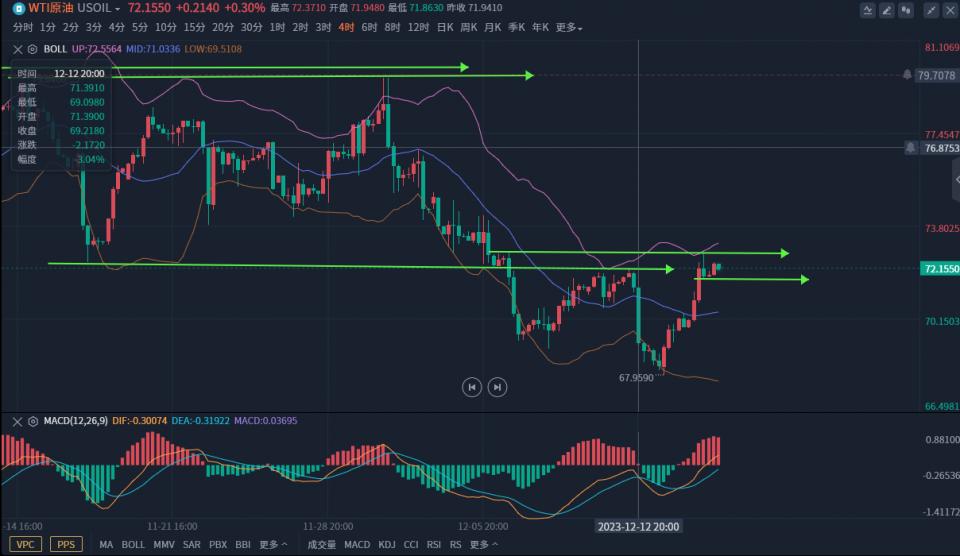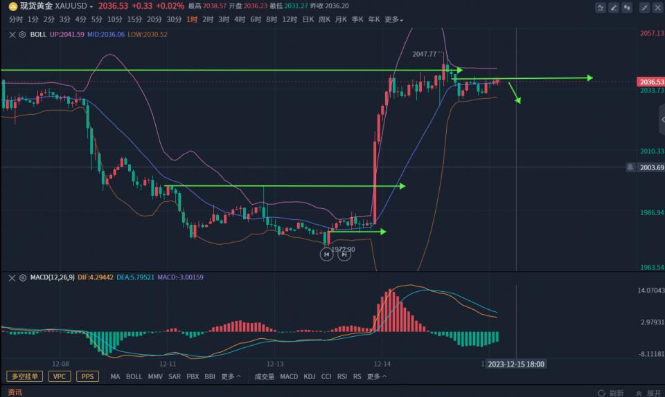 为什么一定坚持看冲高回落,昨日午间文章思路也详细分析,虽然鲍威尔讲话偏鸽派,市场降息呼声高涨,就算明年降息也是缓慢降息,相对疫情前利率仍处高位,而中东局势提升避险情绪消退,并未有长期支撑黄金上涨基本面。今日方面、昨日如期实现突破2040关键压制冲高回落,而且凌晨跌幅比较大,基本吞没了昨日美盘上涨的全部涨幅,如期强势,凌晨跌幅一定不会太大,所以今日走势震荡回撤可能性比较大,那么反抽高点2038就是日内关键分水岭,2038下方布局空,除非欧盘价格站稳2038,今日暂不考虑多。下方关注昨日低点,日内一旦出现破低,基本就确立日内震荡回撤走势。