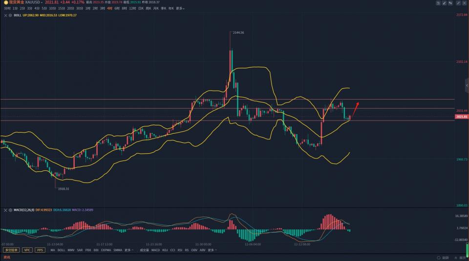 从日线级别来看,布林带收口,价格属于上涨之后的正常盘整,短线价格回踩布林中轨的迹象,4小时布林带开口,价格在上轨一线遇阻回撤至中轨,早盘在中轨一线支撑上涨,短线还是回调做多为主,重点关注2018-2020一线支撑。