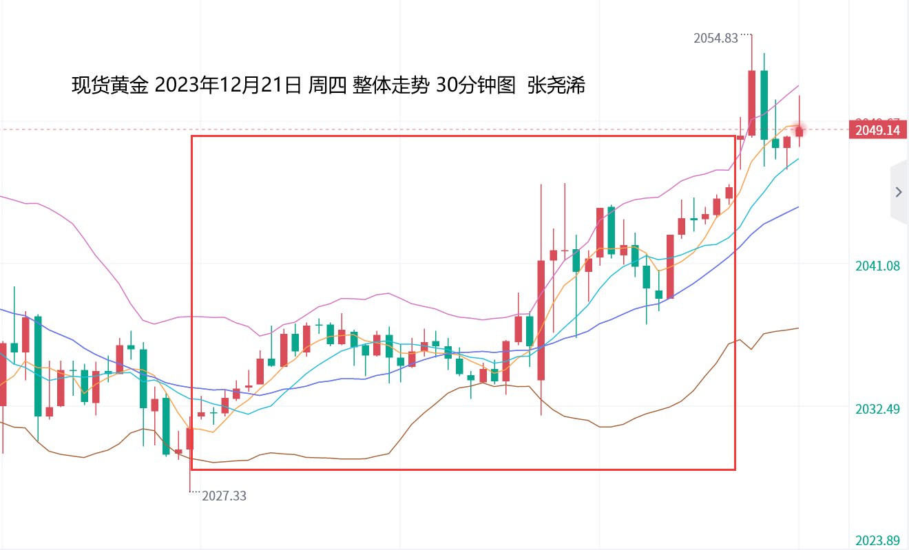 整体来看,将会对金价造成震荡偏强的走势行情。继续关注布林带上轨附近目标阻力和2075美元附近的阻力情况。