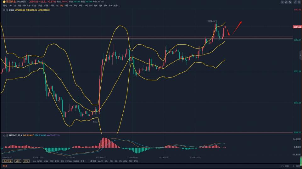 上周五美国11月PCE环比出现负增长,为近三年首次,强化了美联储明年3月份降息的概率,这一度帮助金价刷新12月5日以来新高至2070附近。早评给出2045-2047区域的多单进场后完美止盈于2060。又有一波朋友跟上吃肉了。另外,地缘局势紧张,也给金价提高避险支撑。如果金价能够顶破2070一项阻力,则有望进一步看向2100关口甚至是月初创下的历史高点2144附近。