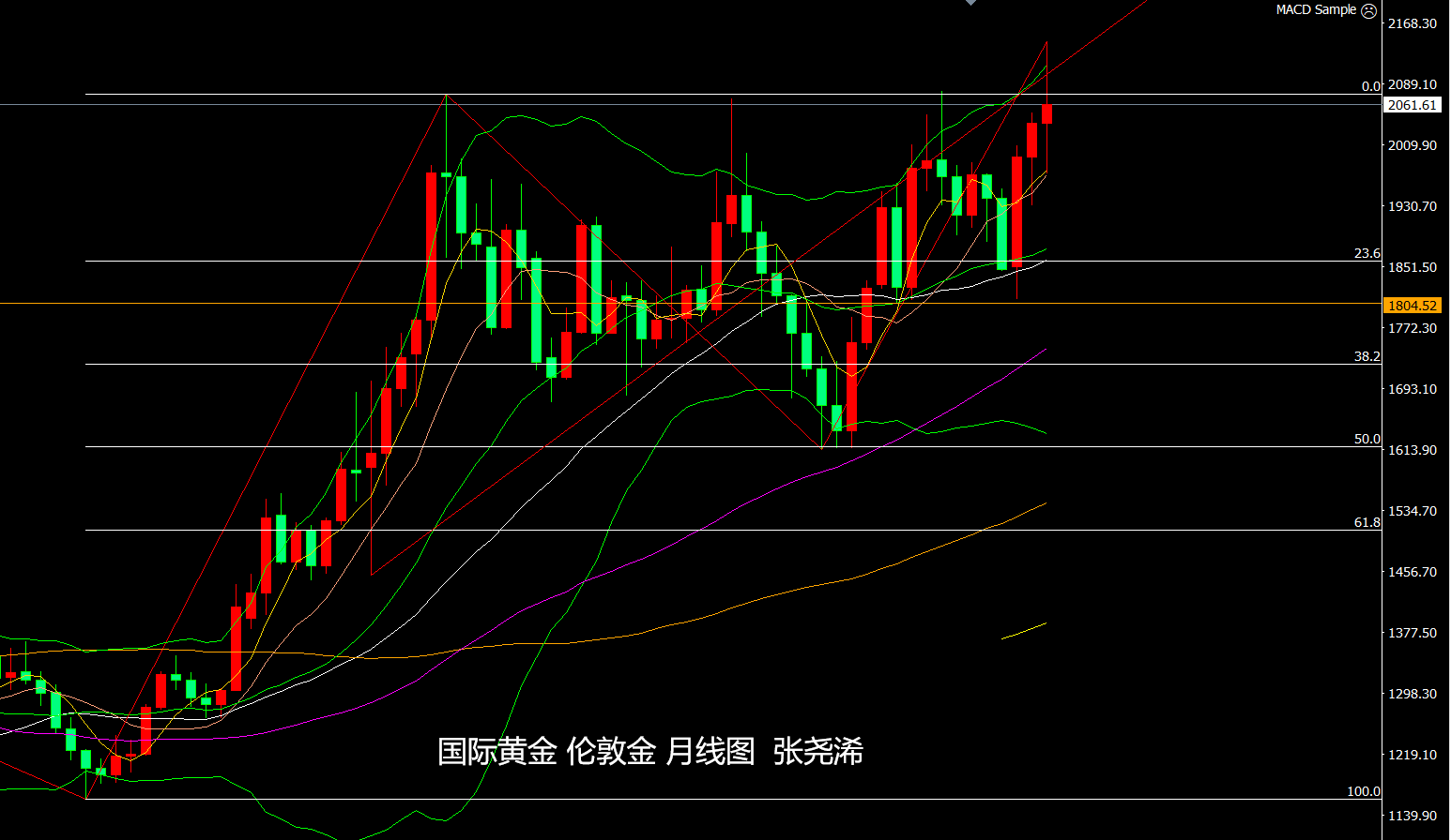 技术上:月图级别,金价本月剧烈震荡,上蹿下跳,目前维持震荡偏强波动,大概率将收取震荡偏十字形态,仍未短中期增强看空回撤压力,但如收线在2075美元上方,则仍有继续冲高刷新历史高点的预期,反之则仍保持看回撤的风险等待;