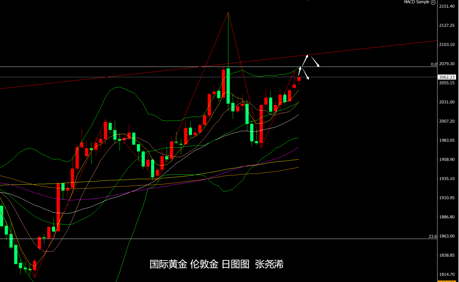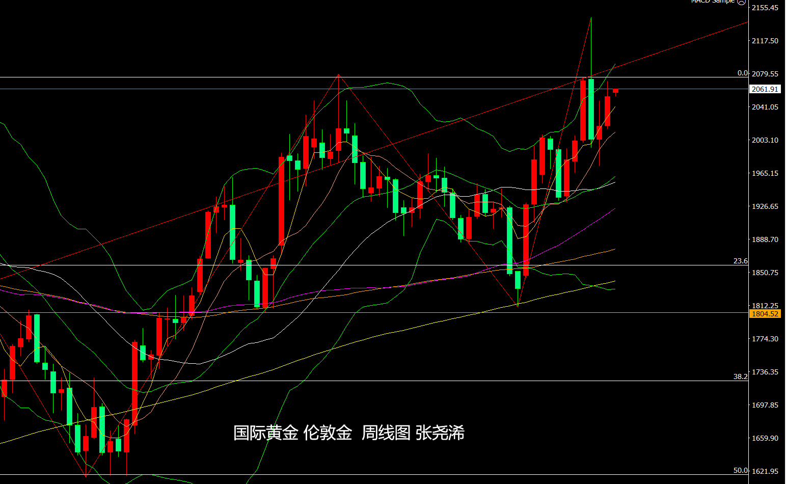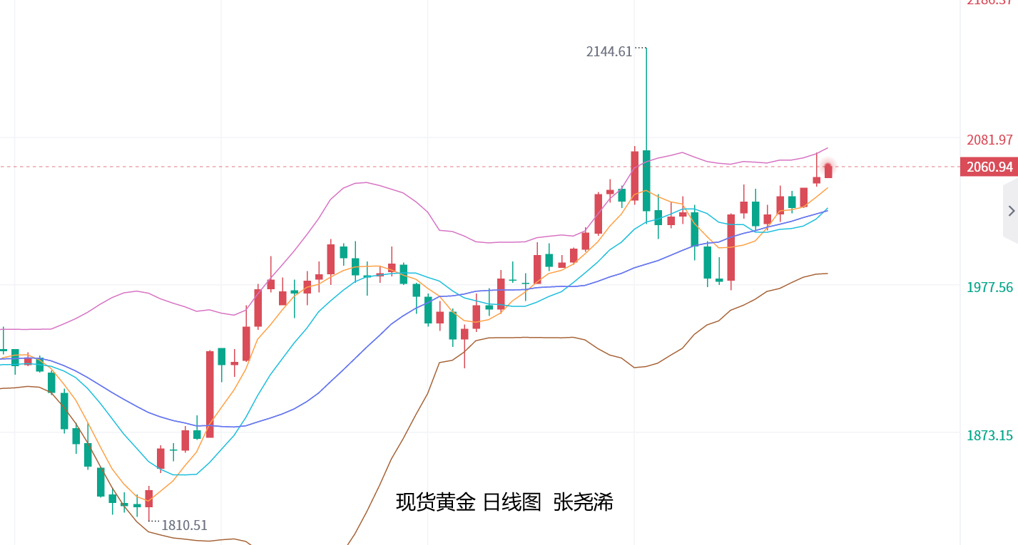 周线级别:金价上周延续反弹继续走强,持稳于5-10周均线上方,也如期触及上轨线目标阻力,虽然有所回撤,但仍未跌至短期均线下方,这暗示仍有再度走强的动力和信号,上方将继续关注2075美元或者2090美元目标阻力,下方则关注5-10周均线支撑看涨,跌破支撑则继续看回撤触及中轨及60周均线。