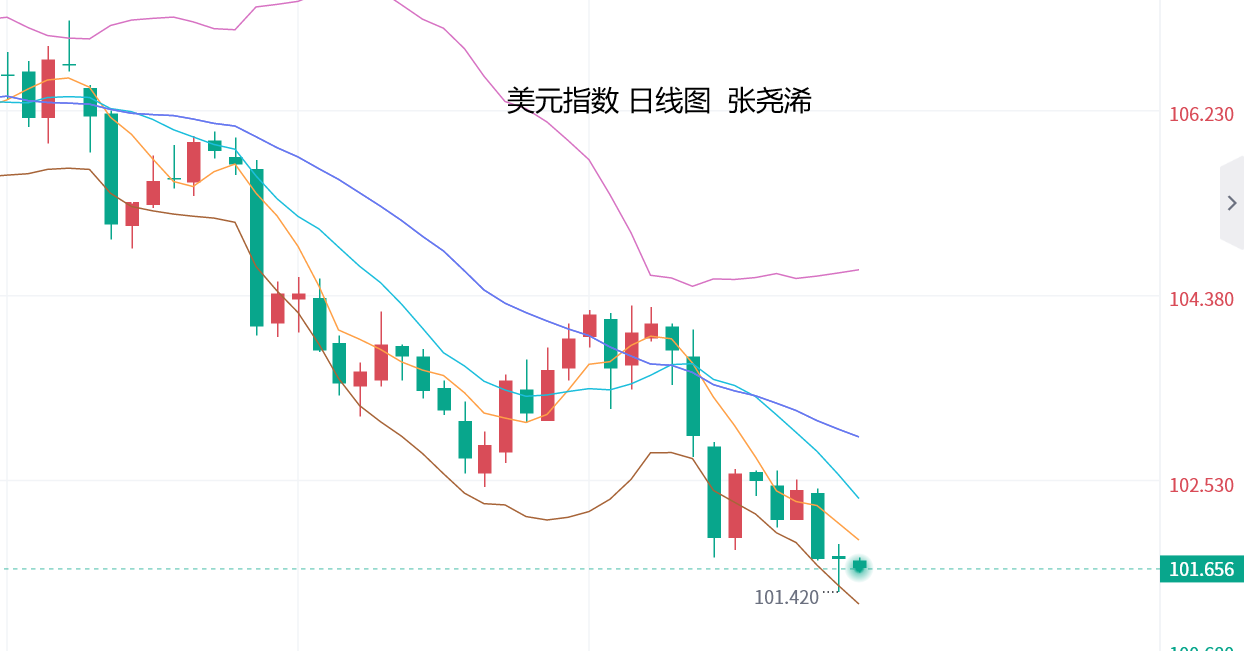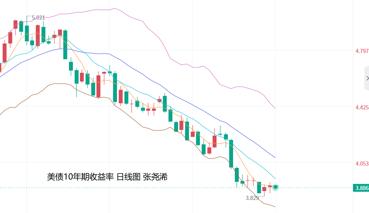 整体上,美元指数日图维持在短期均线下方,布林带开口向下,周图及月图也亦是如此,暗示短期走势仍偏空为主,将会对金价支撑,美债10年期收益率虽有回升,但仍处于回落趋势中,而对金价压力有限。金价短期或继续维持在中轨上方波动。等待进一步的政策和讲话指引。
