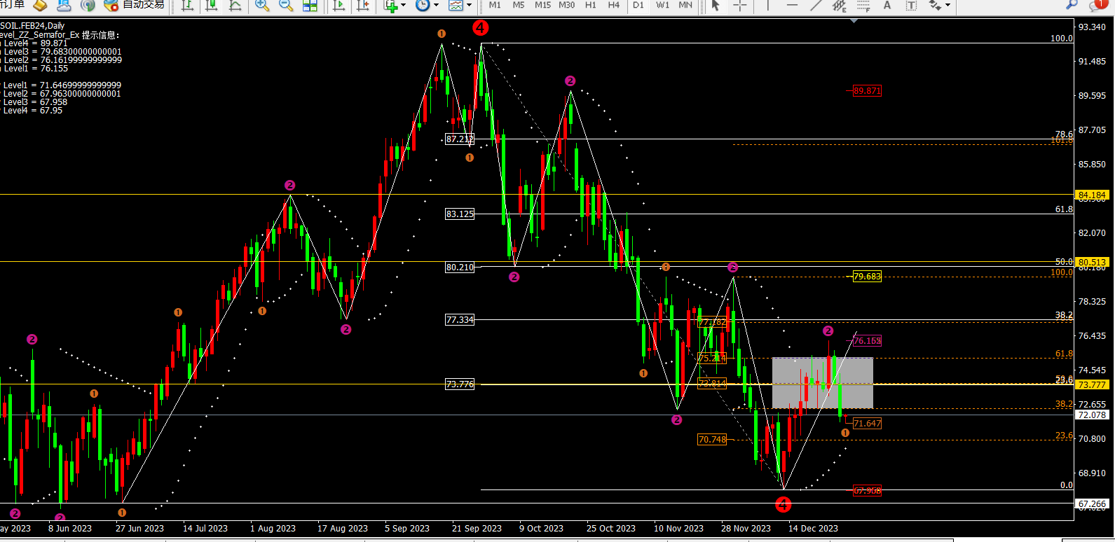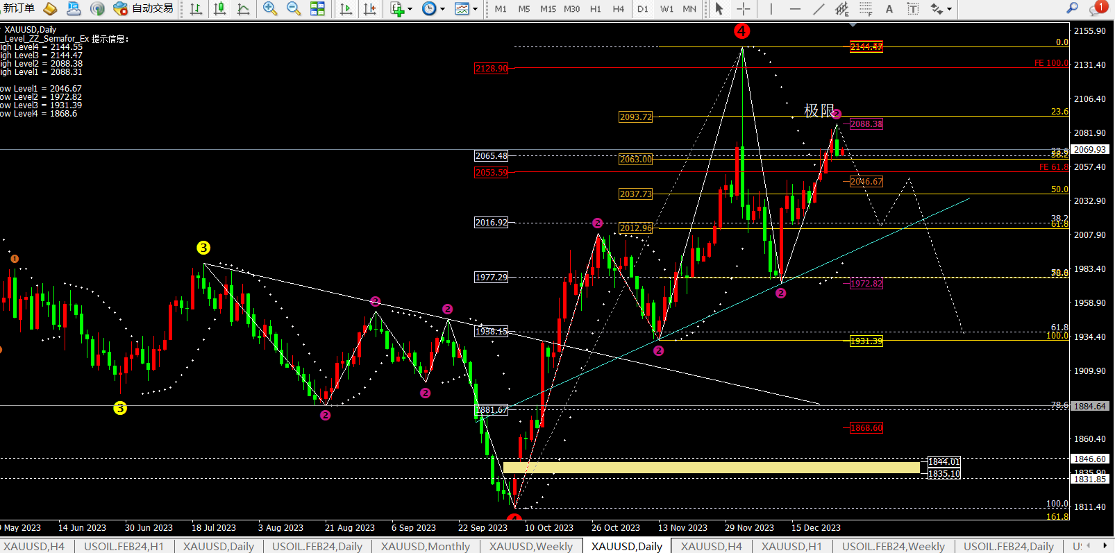 ③ 根据日线的斐波拉契回调线判断目前支撑2063-65一线,其次是2053一线;最后是2038附近。而天成认为短期高点出现2024年首月黄金将开启回落。