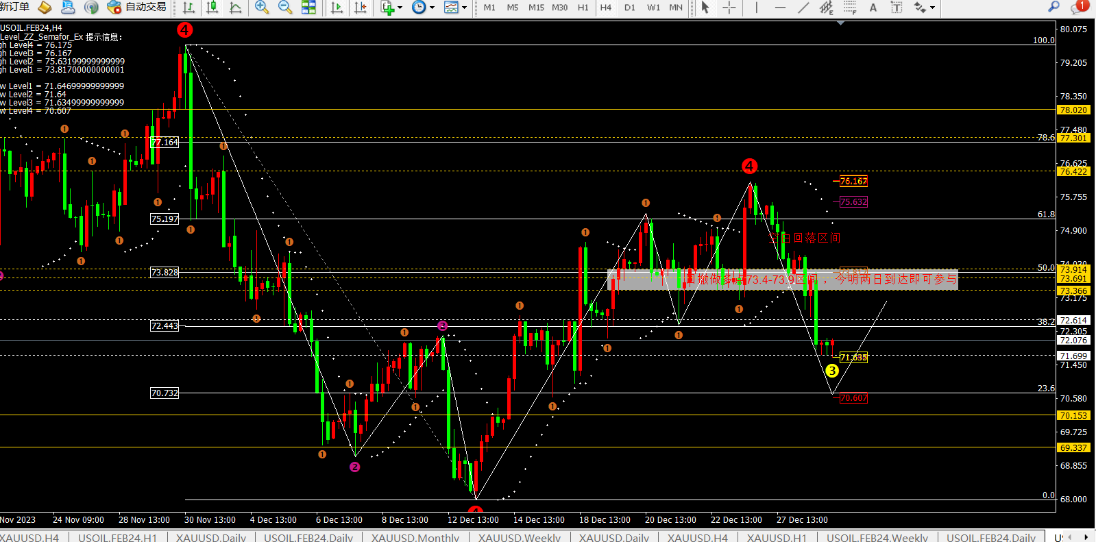 因此4小时看短期大幅反弹至73-73.7的概率较小,因此白盘高位空基本没戏。而根据斐波拉契回调线判断目前支撑在70.7附近。