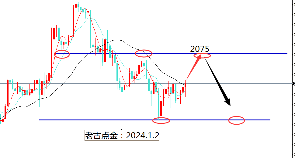在过去的一年里黄金基本是多头的天下,主要原因是因为俄乌局势和新的巴以局势导致,在2024年这两个地缘因素还会继续支撑黄金多头,大周期依然是多头天下,上周周线收十字星,多头上升出现了疲软的信号,2088目前还无法确定是大周期的顶头,但是可以确定是短线的小头,今天周一我们先看一个区间震荡的高位修复,今天难跑单边,而是多空会反反复复来回跑,震荡行情多空都是有机会的,上周五我们布局了2061多单吃肉爽歪歪,今天我们关注2050-2075这个区间的肉。