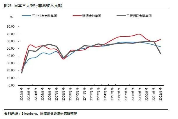收入结构上,日本银行业非息收入占比持续提升。以日本三大银行为例,非利息收入占净收入比重从2000年初的约20%提升至近年来的约60%。