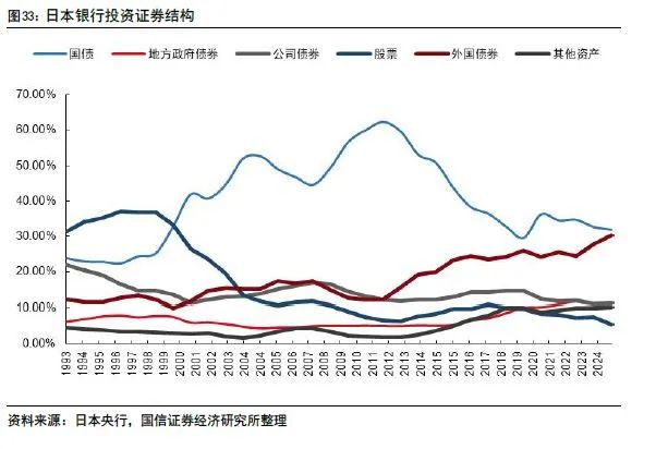 1997年之前日本银行业证券投资结构较为稳定,1997年后日本加大了国债配置比例。在2011年日本陷入零低利率环境后,国债的配置规模大幅压缩,而是大幅增加了海外债券的配置比例。