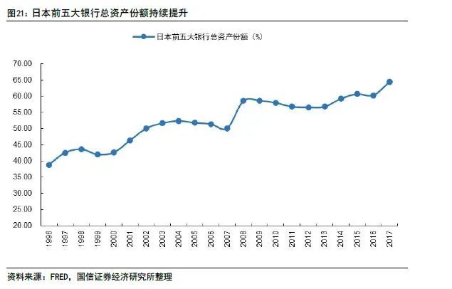 1998年之后,日本银行业的重组核心是提升经营能力和国际竞争力,按市场化原则重组,主要是都市银行间的重组,前五大银行总资产市场份额提升至60%以上。全球金融自由化越演越烈,1999年美国通过了《金融服务现代法案》,美国大型银行国际竞争力大幅增强。相比较,日本银行业深陷房地产泡沫破灭的泥潭,国际地位大幅下降。为了走出困境,同时也为了应对国际全能型银行的竞争,掀起了日本银行业大规模合并浪潮。日本11家都市银行经过一番分化组合后形成现在的5大银行,分别为三菱日联(MUFG)银行、瑞穗银行、三井住友银行、大和银行(Resona Bank)和崎玉里索纳银行(Saitama Resona Bank)。