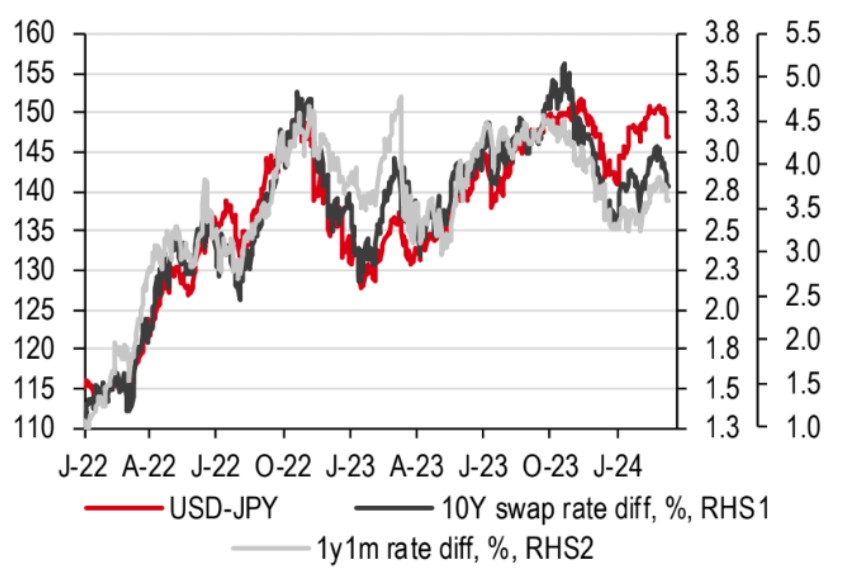 推动这一预期复苏的关键因素之一是美国和日本之间的收益率差有望收窄。汇丰银行亚洲外汇研究主管Joey Chew表示:“我们的回归分析表明,利差是美元兑日元的关键驱动因素。我们估计,10年期利差变动100个基点,可能导致美元兑日元汇率变动7-9。”