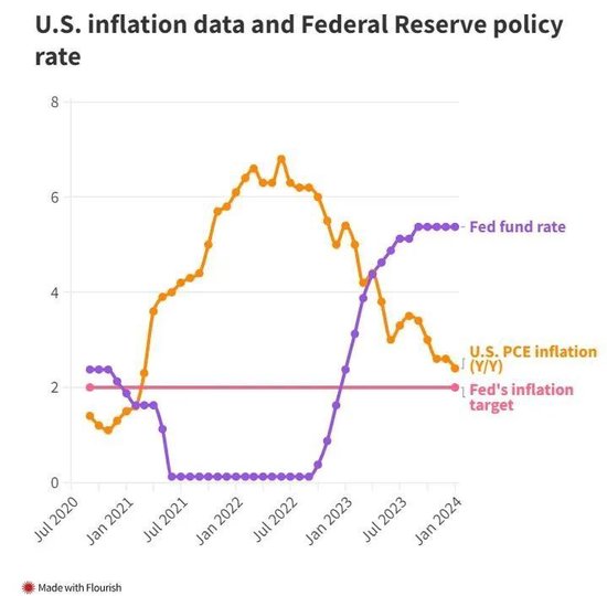 美联储首选指标评估的通货膨胀率目前为2.4%,仍高于美联储2%的目标。美联储在1月份的会议上将利率稳定在5.25%至5.5%的区间。市场目前预计美联储将在6月开始降息25个基点。